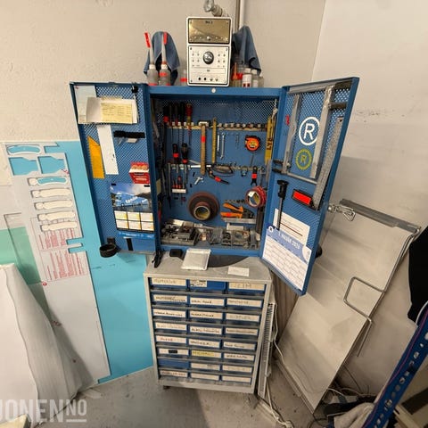Reolen leveres komplett med plastbokser og innhold slik det fremkommer på bilder. Innholdet består av en blanding av ulike typer komponenter og festemidler i forskjellige størrelser og materialer.