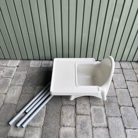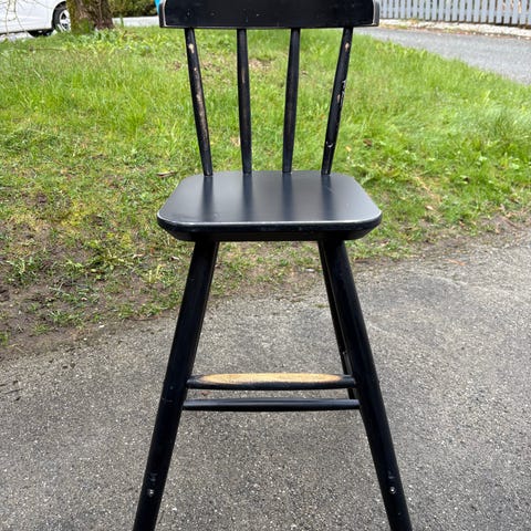 IKEA høy barnestol i tre. Stolen har bøyle foran og fotbrett, samt rygg med spiler. Egnet som spise- eller sitteplass for små barn ved bord. Klassisk utforming i naturfarget treverk som passer inn i de fleste interiører.