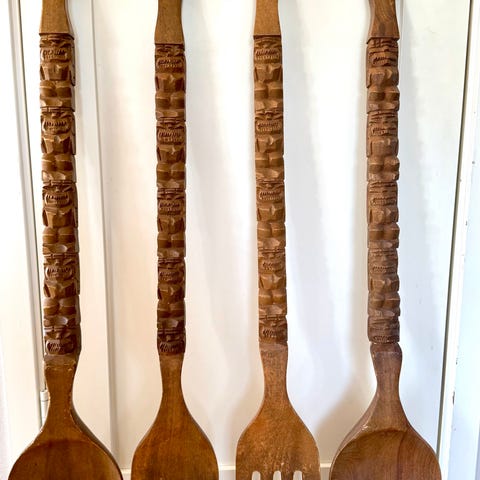 Redskapene har dreide treskaft og hvite keramiske hoder med blå blomstermotiv. I settet inngår en serveringsgaffel, en stekespade og et redskap med rundt hode, alle med samme dekor. Lengden er rundt 33 cm på gaffel og stekespade, ca 28 cm på stamper. Passer best som kjøkkenpynt/dekor på kjøkkenet.