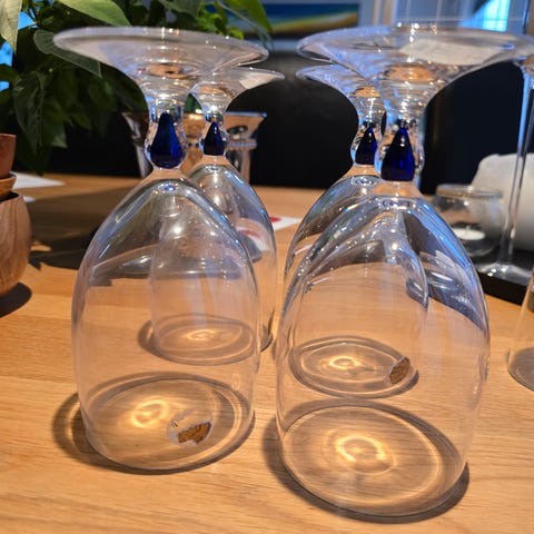 Krystallglass i serien blå dråpe/Venice Sapphire Blue teardrop. 8 cognac glass og 5 likørglass. Ikke synlig brukt.