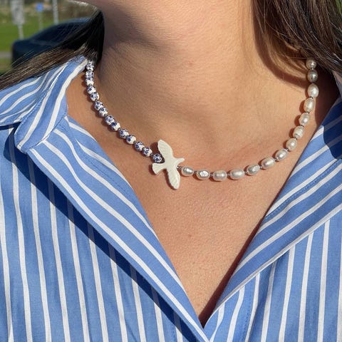 Perlekjede halskjede rødt og hvitt glass