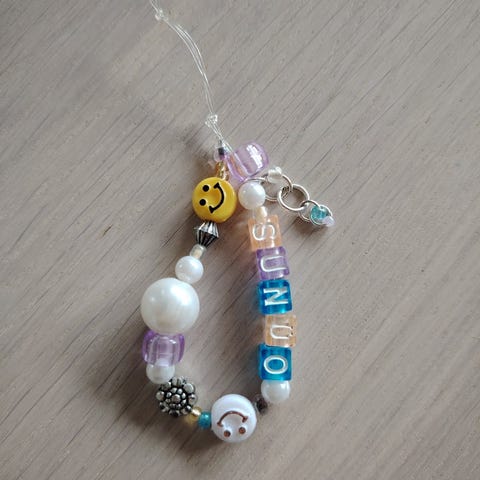 Halskjede med hvite perler og fargerike anheng