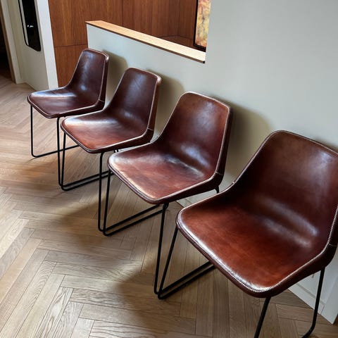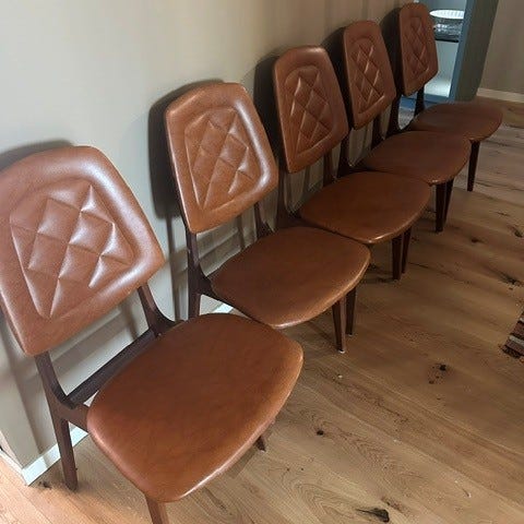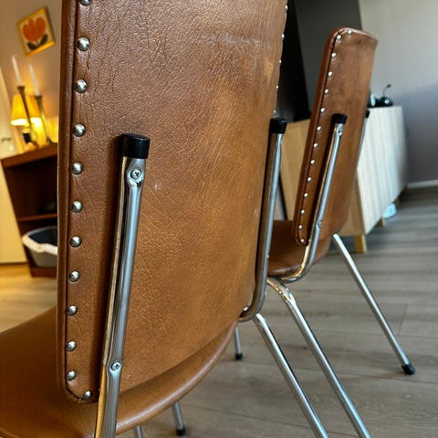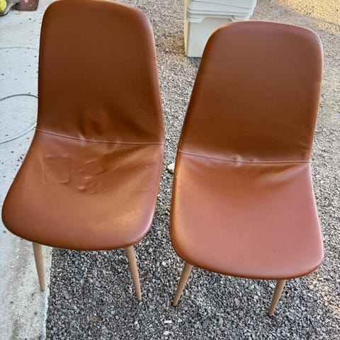 Vi har fire mørkebrune stoler hvor beina har blitt spraymalt i kromfarge, men malingen har begynt å flasse av noen steder.