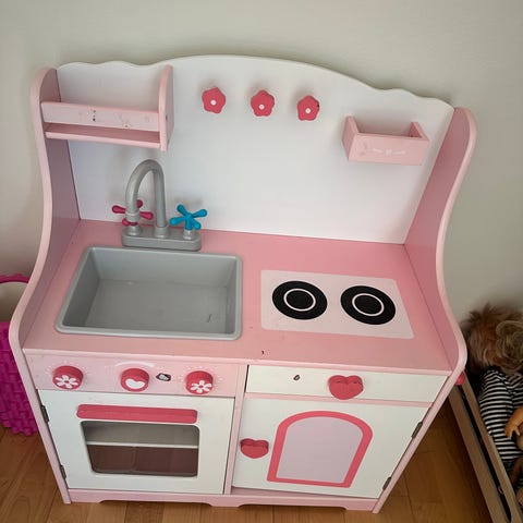 Jollyroom dukkehus i tre med tre etasjer og åpen front. Huset har trykte interiørdetaljer i rosa og lyse farger på vegger og gulv, samt utvendig balkong i øverste etasje. Taket er utformet med mønster i lyseblå og hvite toner. Dukkehuset passer til mindre dukker og figurer og kan plasseres frittstående inntil vegg eller i et hjørne av rommet. Laget hovedsakelig i treverk med malte og trykte overflater.