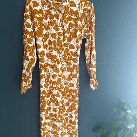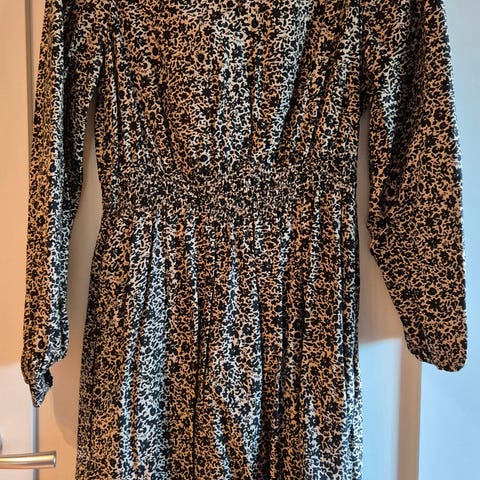 Moss Copenhagen hverdagskjole for dame i størrelse S. Kjolen er svart med lyst blomsterprint og er laget i viskose. Den har V-hals, lange ermer med mansjetter og knappelukking, samt innsvinget midje som gir en lett A-formet fasong. Passer som hverdagskjole og til enkle, pene anledninger.