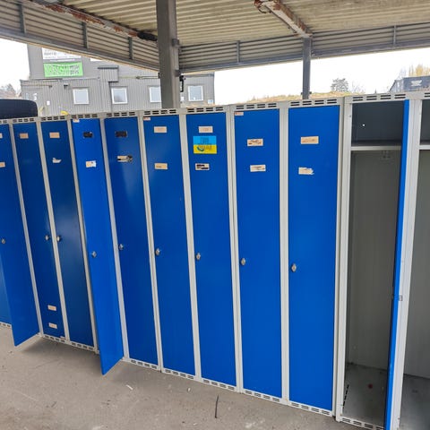 Garderobeskap, lagring, oppbevaring, klesskap, låsbart skap, metallskap, klesoppbevaring, container, brakke, garasjeinnredning