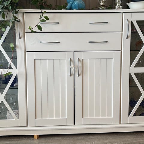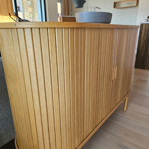 Skjenk fra Jysk. Kjøpt i 2024 og har stått på samme plass. Mye plass inne, godt med to lange hyller for oppbevaring av f.eks treningsutstyr.