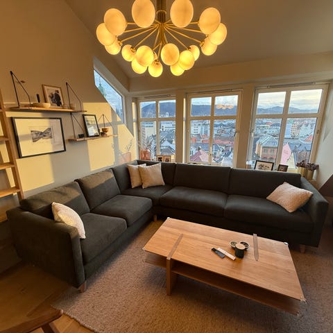 Kjøpt ny til vår forrige leilighet i 2021 da den passet helt perfekt i stuen der (se bilde). Vi har nå flyttet og må dessverre selge den fordi den ble for stor i vår nye stue. Den er pent brukt og har ingen synlige skader. Kommer fra røyk og dyrefritt hjem.