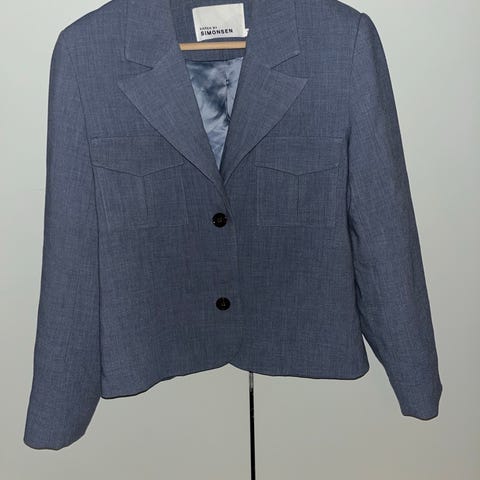 Hettermarks blazer for dame i størrelse S. Kanskje litt liten i størrelsen. Jakken er laget i ull og har blå farge. Den har klassisk krage, knappelukking foran og flere lommer. Passer til bruk i hverdagen eller til mer formelle anledninger der en enkel ullblazer er ønsket.