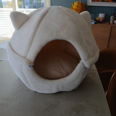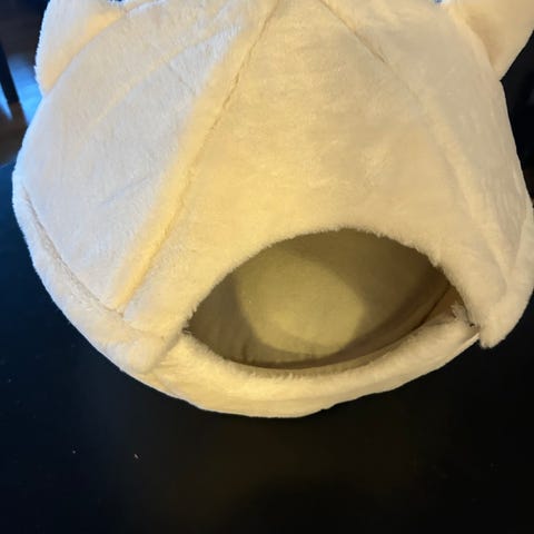 Kattehule i hvit plysj med huleformet åpning. Myk, polstret liggeflate inni som gir et lunt sted for katten å hvile. Passer til innendørs bruk for katt eller liten hund. Avtakbar pute på innsiden for enklere rengjøring. Nøytral farge som passer inn i de fleste hjemmemiljøer.