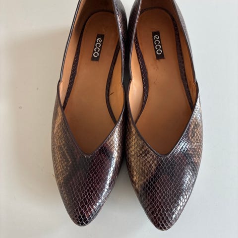 Gummisåler. Innleggssålen har mønster og Ecco-logo. Modellen passer både til hverdagsbruk og penere anledninger. Har kun vært i bruk et par ganger inne.