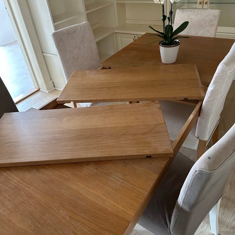 Jeg selger spisebordet vårt kjøpt på IKEA inkludert 8 stoler . Bordet kan bli betydelig større med en ileggsplate, noe som er en svært praktisk løsning for å tilpasse bordstørrelsen til antall gjester og hverdagsbehov. Ileggsplater er enkle å legge til .Stolene er gode stoler og lette å flytte . Trekk kan tas av å vaskes