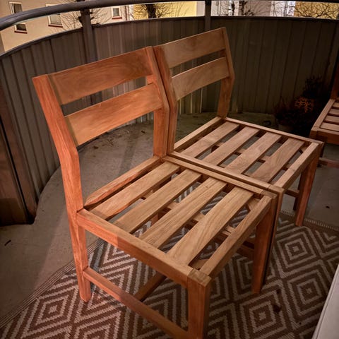 8 hagestoler /spisestoler i heltre teak. Tre av stolene har skader som vist på de to siste bildene, men har vært helt fine i bruk likevel.