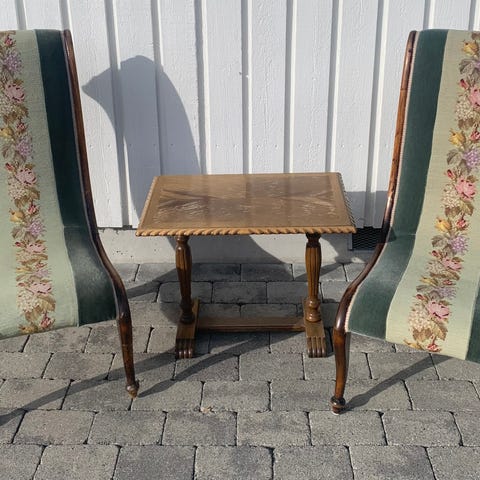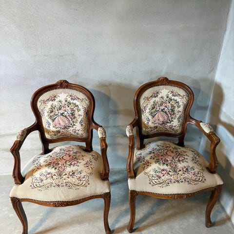 Stolene har detaljerte broderier, solid treverk og et klassisk uttrykk som passer både moderne og tradisjonelle hjem. Stoffet er stramt, rent og uten slitasje. Treverket er stabilt og uten skader.