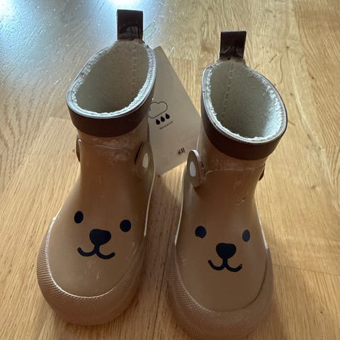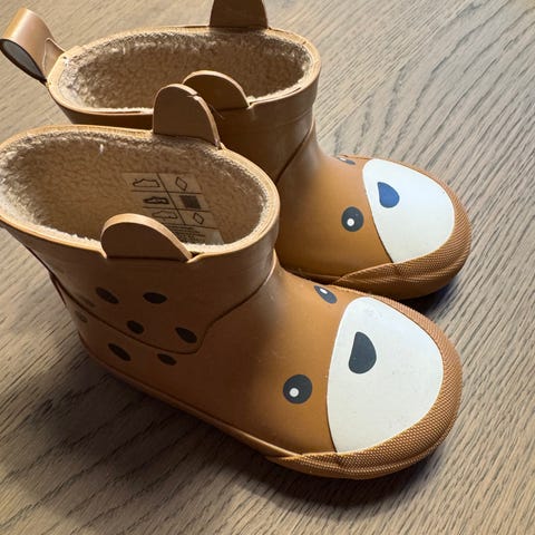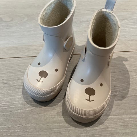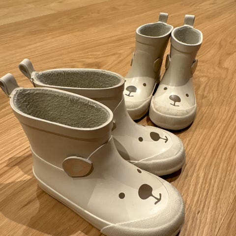 Pent brukte gummistøvler brukt en sesong av ett barn. Bruksmerker, men ingen riper eller slitasje. Fargen er en lags beige/lys pudder-rosa. Veldig søte, og jenta mi elsket dem🌦️