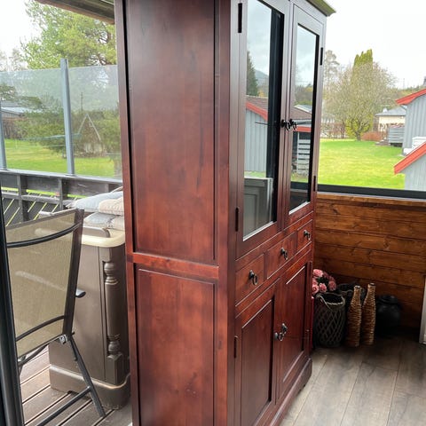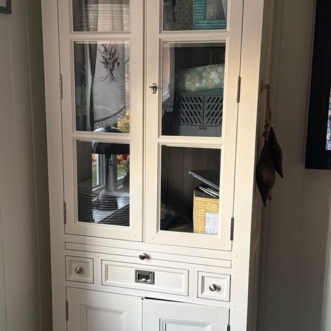 Selger 4 stk like vitrineskap i lys/beige farge. Skapene har glassdører øverst som passer perfekt til oppbevaring og fremvisning av servise, glass eller pynt, og lukket oppbevaring nederst.