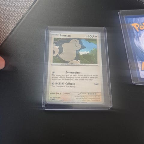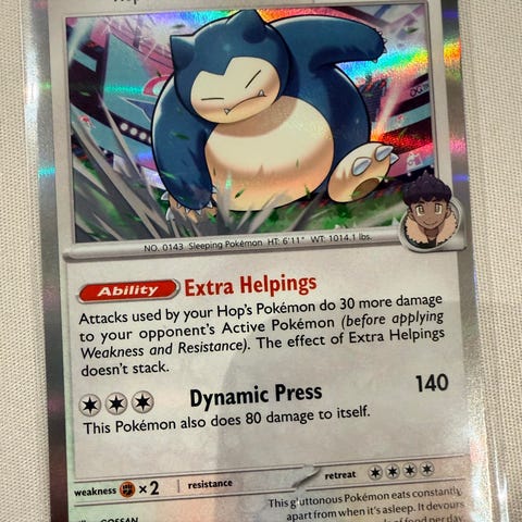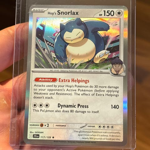 Pokémon Hap’s Snorlax samlekort med holografisk folie. Kortet viser Pokémonen Snorlax med 150 HP og angrepene Extra Helpings og Dynamic Press. Kortet har fargeløs energitype og svakhet mot Fighting ×2. Nummerering nederst på kortet er 117/189. Egnet for samling eller spill i Pokémon Trading Card Game.