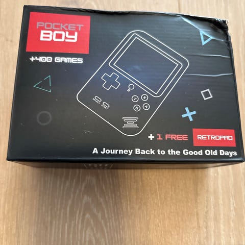 Retrogame håndholdt spillkonsoll med 3,0" TFT-skjerm og innebygde 400 spill. Konsollen er rød med sorte knapper og har innebygde høyttalere. Pakken inkluderer en ekstern kablet håndkontroller i svart med røde knapper, samt AV-kabler for tilkobling til TV med komposittinngang (gul, rød, hvit). Egnet for én eller to spillere ved bruk av den medfølgende kontrolleren. Strømforsyning og eventuell batteritype er ikke spesifisert på bildene.