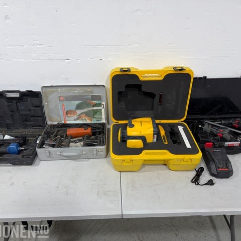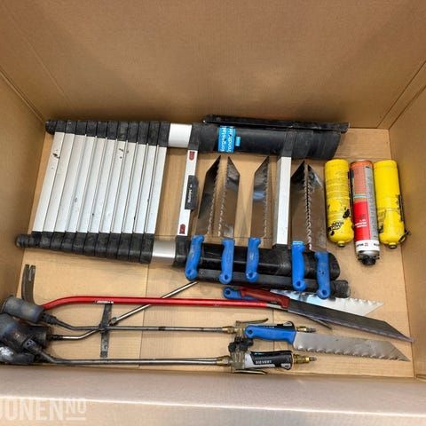 Bygg- og verkstedutstyr som vist på bilder. Inneholder blant annet støvsugere, arbeidslys på stativ, stige, hullsagsett, gassbrennere, lastestropper og elektrisk verktøy i koffert.🔹 Kärcher Professional våt-/tørrstøvsuger