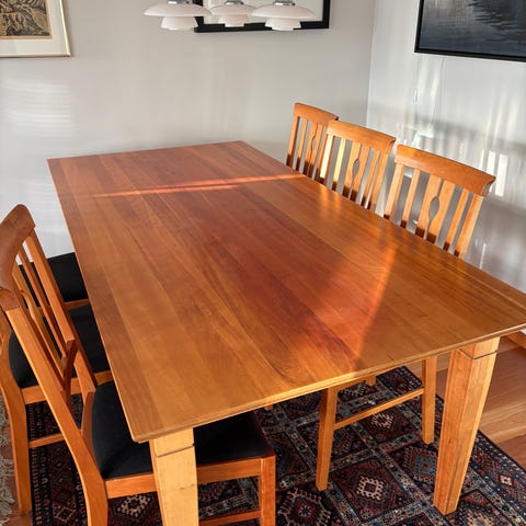 Nydelig teak spisebord som ble renset og satt inn med olje i fjor høst.