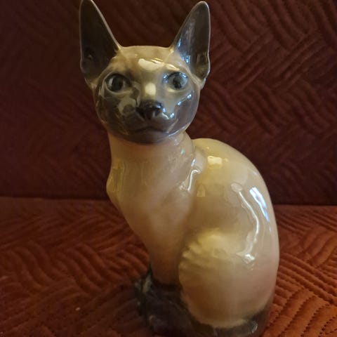 Royal Copenhagen figur av liggende okse i glasert porselen. Figuren har brunspettet dekor og naturtro utforming med detaljerte trekk i hode, kropp og hale. Undersiden er merket med Royal Copenhagen-stempel, modellnummer 2595, bølgestreker og innpresset krone. Egner seg som dekorativ gjenstand i hylle, skjenk eller vinduskarm.
