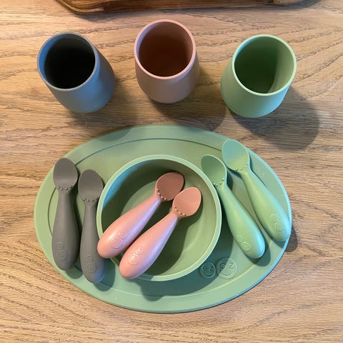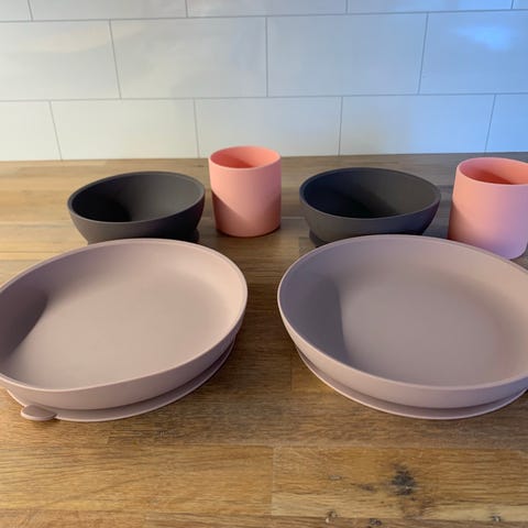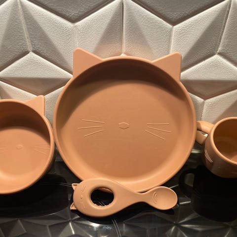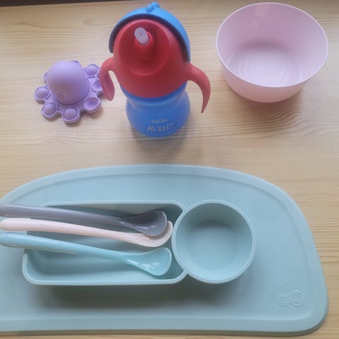 Silikon tallerken med solid sugekopp under fra done by deere, samt silikon tutekopp fra Liewood (litt utvidet hull i toppen men fungerer fint likevel da det er silikon). Med traktor motiv. Selges samlet.