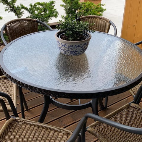 Hagebord med 4 stoler. Rundt bord med glassplate og metallramme. Stolene har metallramme og sete/rygg i nettingmateriale. Farge svart. Passer til uteplass, terrasse eller hage som spise- og sittegruppe.