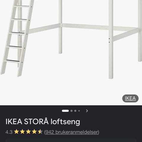 IKEA STORÅ loftseng i størrelse 140x200 cm. Sengen er i hvit farge og har stige på siden for adkomst til soveplassen. Loftsengen gir god plass under til for eksempel skrivepult, oppbevaring eller sitteplass. Egnet for standard madrass i størrelse 140x200 cm.