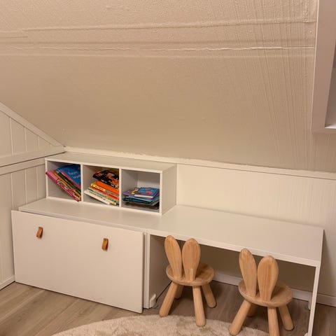 Vi har to Trofast reoler, en Trofast vegghylle, to stoler og to bokhyller + arbeidsbenk.