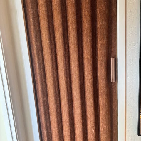 Har stått lent inntil vegg bak vitrineskap, men ikke festet. Ikke synlig brukt og uten skruehull/lim osv. Lager en behagelig romfølelse og fin akustikk i rommet. Flott valnøttfarge som passer perfekt inn i ethvert hjem - har vært brukt i stue, men kan fint tilpasses soverom, gang osv.