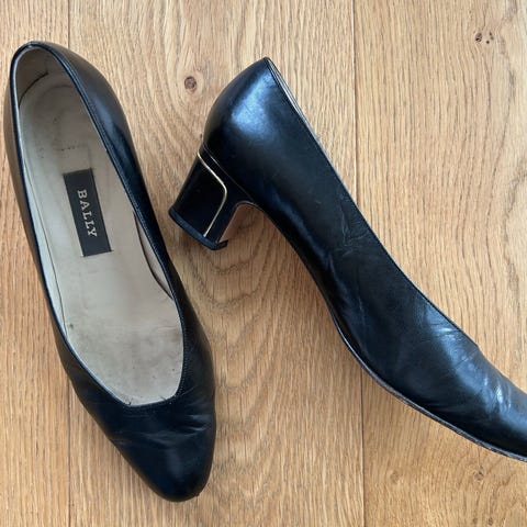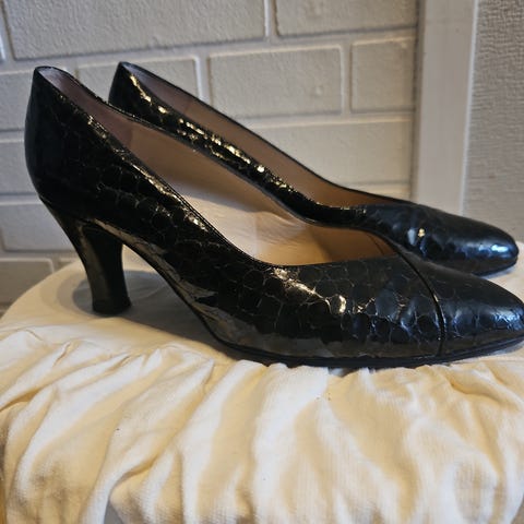 Pene sko med kraftige hæler i svart semsket skinn inkl hæl. Lær på innsiden. Laget i Italia fra DON DONNA. Størrelse 39. Kjøpt på begynnelsen av 1990-tallet, tror jeg, men ikke vært i bruk de siste tiårene. Normal, men lite aldersrelatert slitasje; mest på undersiden av skoenes fremre del, der trykket fra kroppsvekten kommer når man går.