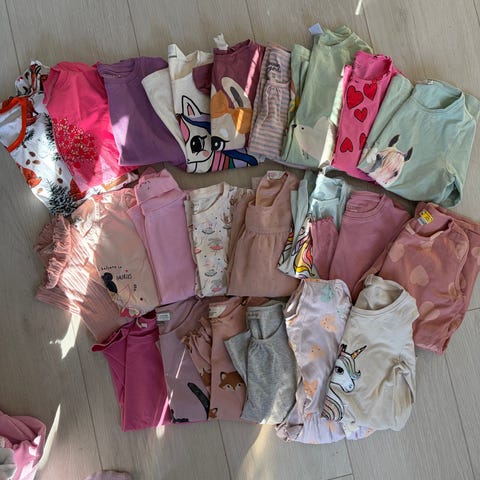 Gensere / tunika 13 stk i hovedsak 122/128, men noe i 116 og 134/140. Noe nytt, lite brukt og noe mye brukt. Kan forekomme flekker, men alt i alt er det helt og pent.