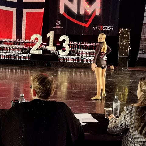 Dansekostyme for dame, one piece I svart og burgunder. Kostymet har lange ermer i gjennomsiktig mesh og partier i tett stoff. Den øvre delen har rund hals og innfelte felt i kontrastfarger, mens den nedre delen har én burgunder og én svart ben-del. Ryggen er åpen med feste oppe ved nakken. Egnet til sceneframføring, konkurranser eller trening innen dans og scenekunst.