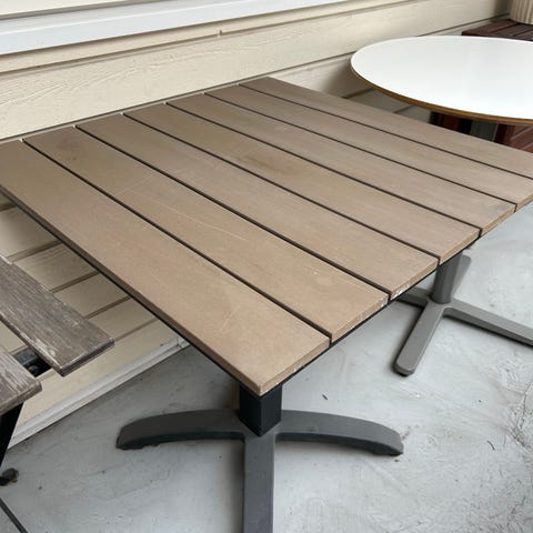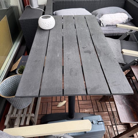 Rund utebord i tre med metallunderstell. Bordplaten består av langsgående treplanker i lys til mellombrun farge. Understellet er i mørklakkert metall med runde ben og tverrstag for stabilitet. Egnet som utebord på balkong, terrasse eller i hage. Ingen spesifikk størrelse, modell eller merke er oppgitt. Selger kun bordet. Den er demontert.