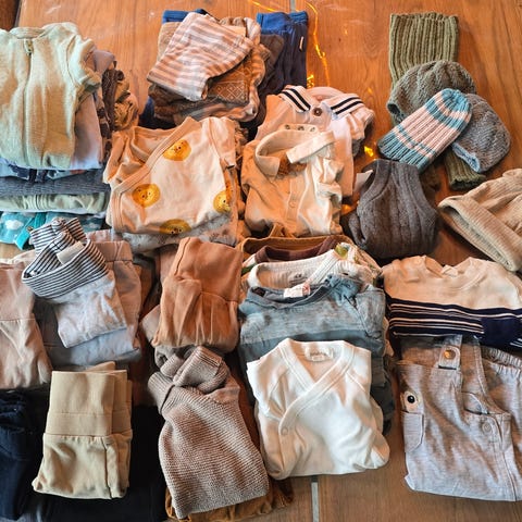 Bukser, bodyer, pysj, strømpebukser, sokker, luer og en heldress. Hovedsaklig bomull, men noe ull. Mulig at noen av ullplaggene har en liten rift eller hull i seg, men mulig å fikse (og/eller bruke).