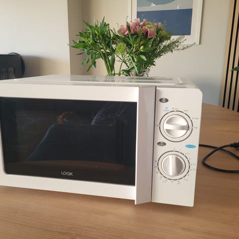 Logik mikrobølgeovn i hvit utførelse. Modellen har mekaniske dreieknapper for innstilling av effekt og tid. Døren har sort front med vindu, og innsiden er utstyrt med roterende glassplate. Standard nettledning med jordet støpsel. Egnet til enkel oppvarming og tining av mat i hjemmet eller på kontor. Mer tekniske detaljer som effekt (W) og volum (liter) fremgår av typeskiltet på baksiden av ovnen.