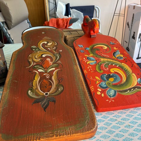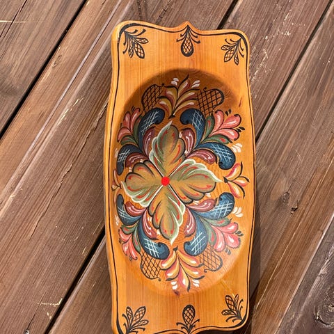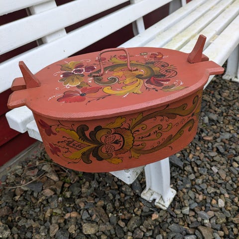Grønn rosemalt kaketine/oppbevaring. Kjenner ikke til historien til denne.