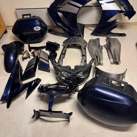 Yamaha XT 350 reservedeler bestående av flere plastdeler og sete. Pakken inneholder blant annet drivstofftank, sidekåper, frontlykt, blinklys, gule radiator-/kjølegitter og gult sete med Yamaha-logo. Delene er beregnet for Yamaha XT 350 motorsykkel og kan brukes som erstatningsdeler eller til oppbygging av sykkel. Farger hovedsakelig svart og gult, i plast og skum/polstret materiale for setet.