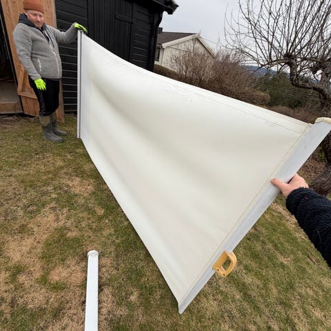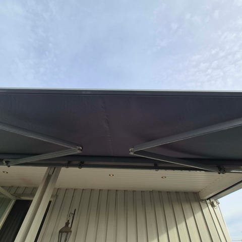 Sideuttak markise med mål 100 cm høyde og 300 cm lengde i grå farge. Egnet som sidevegg eller skjerming på terrasse, balkong eller uteplass. Kan trekkes ut ved behov og rulles inn igjen når den ikke er i bruk.. Kr 800.
