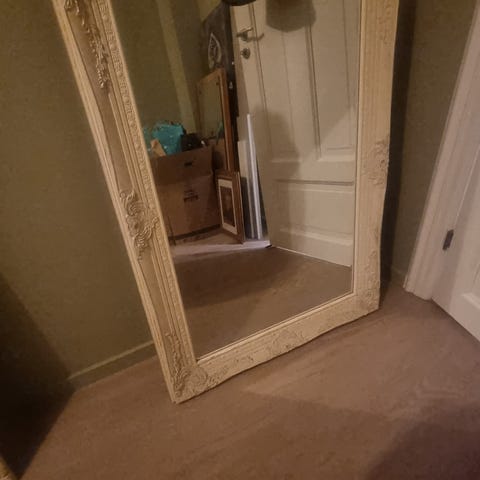 Flott rektangulært speil med gullfarget ramme. Speilet har en enkel, rett ramme rundt hele glassflaten og en horisontal dekorlinje på fronten. Passer til bruk i gang, soverom eller stue, enten stående på gulv eller hengende på vegg, avhengig av opphengsløsning som følger med speilet.