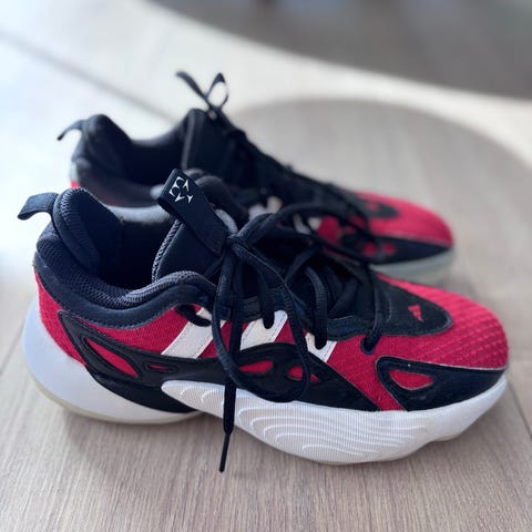 Reebok basketsko i størrelse 37. Skoene er lave med snøring og har overdel i hovedsakelig hvitt materiale med røde og gule detaljer. Sålen er mønstret med runde felter under forfoten og hælen, tilpasset bruk på basketballbane. Innvendig fôr er rødt. Egnet som basketsko eller til generell bruk som sportssko.