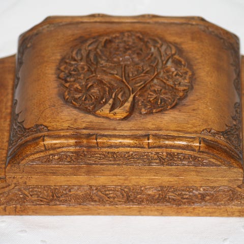 Selger et meget dekorativt og flott utskåret skrin i lyst treverk. Skrinet har detaljerte relieffutskjæringer på alle sider, med et sjarmerende motiv av en fugl (and) omgitt av blomster og bladverk.