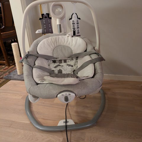 Elektrisk vippestol til baby i grå og lysegrå farger. Stolen har polstret sete med hodestøtte og integrert sele for å holde barnet på plass. Bøylen over setet har leker hengende for visuell stimulering. Basen er buet for stabilitet, og vippestolen drives elektrisk via ledning som følger med. Egnet til små barn/baby for rolig vugging og avslapning under tilsyn av voksen.