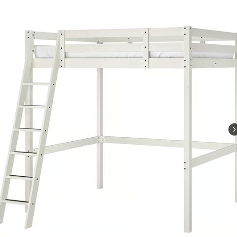 Hvit mellomhøy loftseng i solid heltre. God plass under til lek eller pult