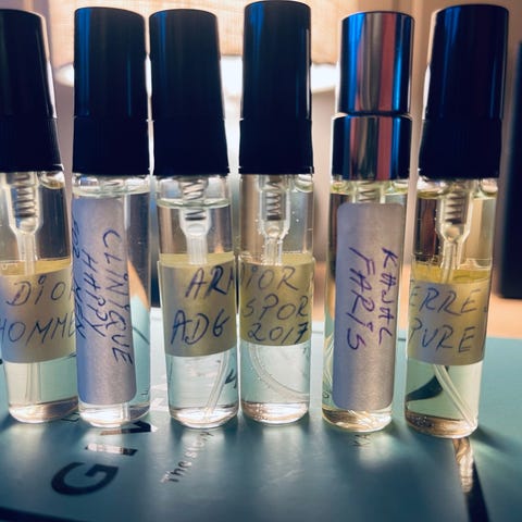 Amouage Interlude 53 5ml , Memo Paris Irish Leather ca 4ml , Xerjoff XJ 1861 Naxos 5ml , Kajal Faris 5ml , Black Sea Lorenzo Pazzaglia 3ml parfymeprøver i små sprayflasker .