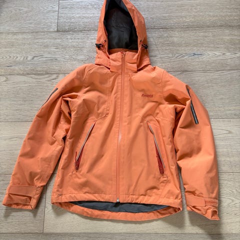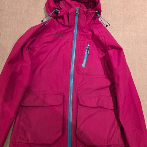 Stikklommer nede også med glidelås. Hetten har stramming bak samt foran i åpning. Solid jakke med teipede sømmer og i svært god stand.