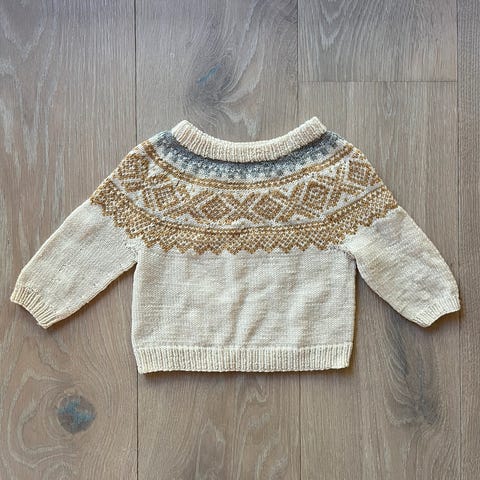 Nydelig hjemmestrikket genser til baby. Jeg kjøpte den selv på Finn, men har dessverre aldri fått brukt den før baby vokste ut av den.