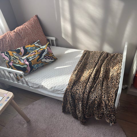 juniorseng i hvit utførelse. Sengen har sengehest på den ene siden og hel gavl i hodeenden. Passer til barn som har vokst ut av sprinkelseng og over i juniorseng. Materiale fremstår som malt tre eller trefiberplate. Egnet til bruk på barnerom. Madrassen kan gjerne følge med i prisen.