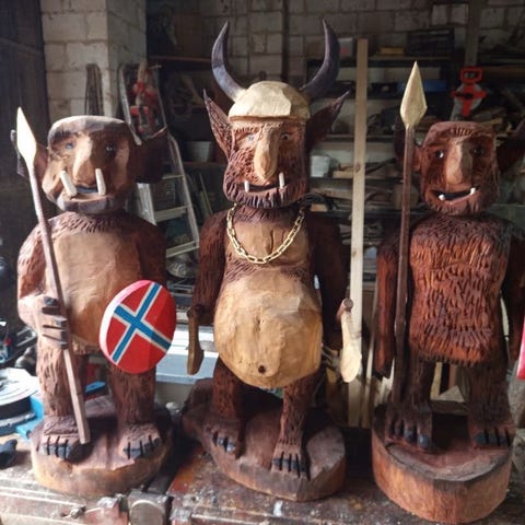 Flott kubbestol laget av meg i bjørk med motiver i dragestil/norrønt stil. Stolen er 85 cm høy og 70 cm bred.