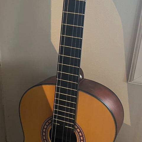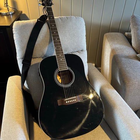 Morgan akustisk gitar i full størrelse med sort høyglans finish. Kroppen har klassisk western/dreadnought-form med stålstrenger. Gitaren har gripebrett med båndmarkeringer og krom stemmeskruer. Egner seg til generell akustisk spilling, øving og akkompagnement., enste man må gjøre litt på gitaren er og stemme hodet på den, eller så er den helt nye strengere og alt på den